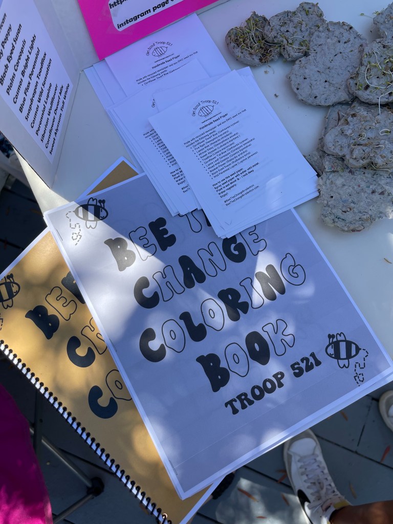 For my leadership role, I created coloring books with fun facts about bees. using procreate on an ipad, I made digital drawings of bees and the different flowers they pollinate. After drawing the images I went on google and looked up some fun facts for kids about bees. Lastly, I added the fun facts and printed out the pages. I shared the coloring books with people at the plant sale and with kids at a day care so they could learn about why bees are important. I also helped update our website.